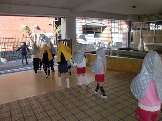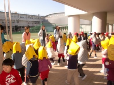 部屋にいた子は、誰のものでも構わないので、防災頭巾をかぶって避難です。