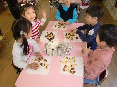 先生が焼いてくれたホットケーキを、子ども達が型抜きし、食べていました。 遊戯室に入った瞬間、とても良いにおい。