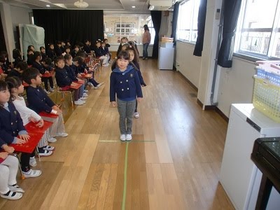 みんな真剣です。 名前を呼ばれて、証書を受け取りに歩いてきています(証書を渡す係の私から見た子ども達)。