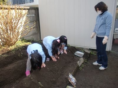 年中組が、裏の畑にじゃがいもの種芋を植えました。