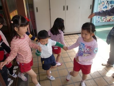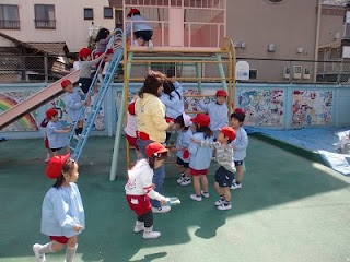 今日は、とても良い天気で、子ども達も伸び伸びと園庭で遊んでいました。幼稚園生活が始まったばかりの子も沢山いるので、遊具の遊び方を一つ一つ伝えてから遊ぶようにしています。滑り台では、階段から上って、お尻をついて座るという約束になっています。子どもって、滑り台が好きですよね。何回も滑ってはのぼり、滑ってはのぼりしている子がいました。 帰る準備の時間。高木幼稚園では、「おかえり」と呼んでいます。今日は、おかえりの時間に、ひよこぐみの部屋に年長組が手伝いに来てくれました。まずは、トイレに連れて行ってあげます。「こっちだよ」と言葉を優しくかけながら歩く年長組さん。とても素敵です!