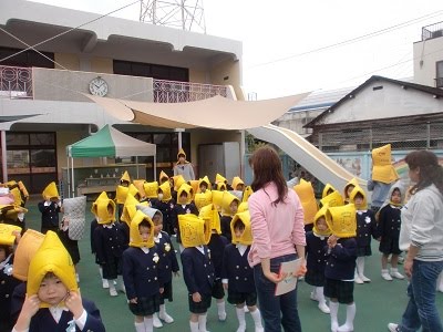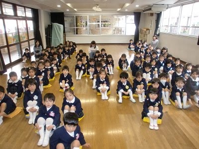 今日は、平成23年度1学期の始業式でした。子ども達みんな元気に登園してくれて、とても嬉しかったです。一人ひとり新しいクラスバッジをつけてもらい、ちょっぴり誇らしげな子ども達でした。 おはよう体操に元気に出てきた子ども達。動物体操という体操と、たいこまつりだ どんどこどんという体操の2つを元気に踊りました。 一度部屋に戻ってから、避難訓練を。当初予定はしていなかったのですが、昨晩も地震があり、年度初めに確認をしておこうと、急遽行いました。なかなか被れない子どもも何人かいました。いざという時には、気持ちも焦り、ますます被れなくなることも考えられます。週末に持ち帰った際には、必ず被る練習、そして袋に片付ける練習をしてくださいね。