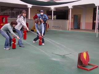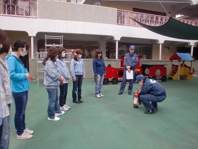 明日から平成23年度の幼稚園が始まります。明日は始業式。進級した子ども達が幼稚園に来る日です。その前日に、職員の研修として、港北消防署の方に来ていただき、避難訓練を行いました。火災が起こったと想定して、訓練スタートです。担任の先生は各部屋に向かいました。火元は職員室という設定。職員室で火事になったことを発見した先生が「火事だ~!!」と周りの人に伝えます。と同時に、放送で幼稚園中にも伝えました。また、初期消火ということで、消火器の準備。(本当に使うことは出来ませんので、持って消火しているつもりで)また、119番に連絡です。今日は、その場にいた消防署の方が答えてくださいました。担任の先生達は、子ども達をひとまず園庭に集め、点呼。トイレや遊戯室なども確認しました。ここまでの流れを見ていた消防署の方からは、「なかなか良いでしょう」とのお言葉をいただきました。 今まで、火事というと部屋の扉を閉めないとと思っていましたが、無理をして閉めることはしなくて良いとの事でした。ただし、火元となる部屋の扉は、危なくなければ閉めてくださいとの事。 次に、消火器の練習です。 皆さんのお宅には、消火器はありますか?そして、実際に使ったことはありますか?一度確認してみてくださいね。 今回は本物は使えませんが、消防署の方が持って来てくださった、中に水が入ったものを使わせていただきました。火元から3~5メートルのところまで持って行き、ピンを抜いてホースの先を持ってレバーを握ります。