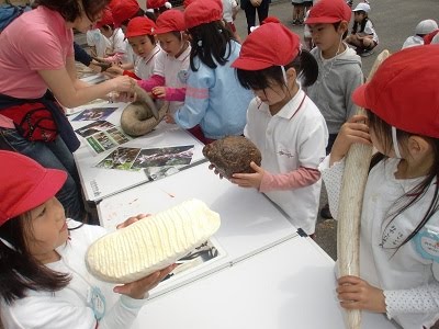 実際に触らせてもらいました。見た目より重く、ざらざらした手触りにびっくりしている子も沢山いました。