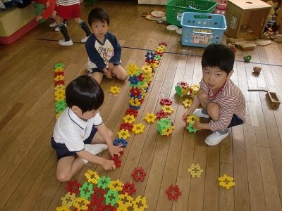 積み木を組み合わせて、ごっこ遊びをしている子。