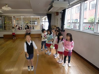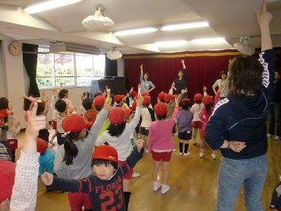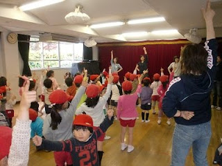 朝、年長組とひよこ組が遊戯室に集まり、一緒に「おはよう体操」をしました。