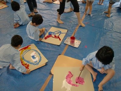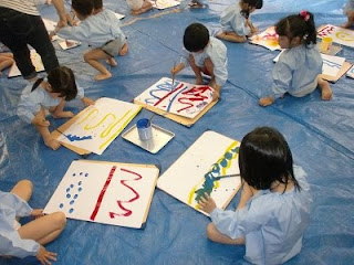 園での日々のようす 2011年6月16日2018年3月28日おさんぽお絵かき さくらぐみは今日おさんぽお絵かきに挑戦。いつもの3色(赤・黄色・青)の絵の具のところに行き、色々な線を描きました。 自分で考えて好きな色の所に行き、紙に色をつけていきます。 違う色の紙に変えて、再度おさんぽお絵かきです。 紙を持って、自分で色を選んで、色をつけていく「おさんぽお絵かき」 絵の具って、子どもが考える・考えたことを実行するということにとても適した素材ですよね。 ちょっぴり汚れますが、これからも何度か経験する機会を持ちたいと思っています。 投稿ナビゲーション 前へ次へ 一覧へ戻る HOME 園での日々のようす おさんぽお絵かき