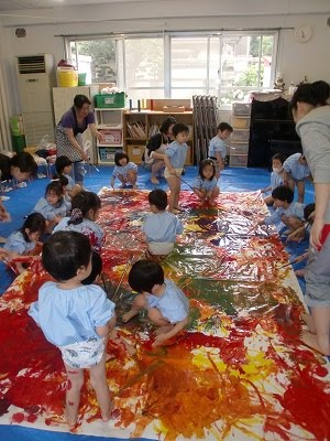 2011年6月13日2018年3月28日えのぐあそび~ひよこ2くみ~ ひよこ2くみは、今日は絵の具あそび。部屋の大きな紙に、黄色の絵の具を垂らしてもらい、筆で伸ばしていきます。 赤の絵の具、青、白と順番に色が増えていき、とうとうこんな感じに↓ 色が混ざって、違う色が出てくるのをとても喜んでいました。 終わった後は、みんなでお掃除。 身体にも沢山絵の具が付きました。 完全には落ちきれていません。お風呂で洗ってあげてください。 お仕事着も汚れてしまいました。お家でのお洗濯、よろしくお願いします。 投稿ナビゲーション 前へ次へ