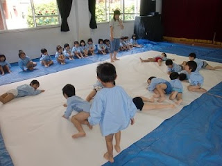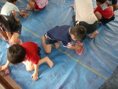 今日は、遊戯室でさくらぐみが絵の具あそびの日。