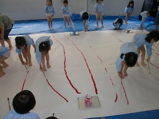 次は、1人1本筆を持ち、絵の具をつけて線をひきます。