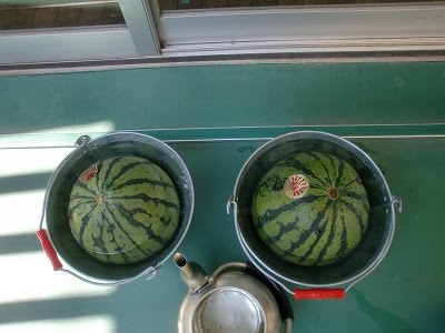 先生にすいかを包丁で切ってもらい「いただきま~す」