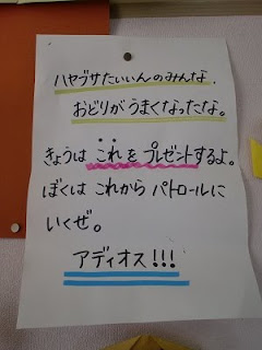 2011年9月30日2018年3月28日年中組に手紙が・・・ 年中組のところに手紙が来て、素敵なベルトを作った子ども達。とても素敵なので、運動会の時に使うことにしたようです。 給食前に、クラスごとに園庭で踊っていました。まずは、さくらぐみ。 最初お客さんで見ていたたんぽぽぐみも、張り切って踊っていました。 丸になったり、歩いたり、踊ったり・・・ ちょっぴり難しいところもあるようですが、楽しそうに踊っていました。 当日まで、約一週間。お楽しみにお待ち下さい。 投稿ナビゲーション 前へ次へ