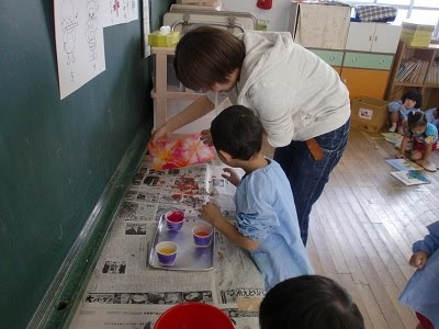 2011年9月29日2018年3月28日そめがみ遊び~ひよこぐみ~ 今日ひよこぐみは、そめがみ遊びをしていました。(運動会前ですが、色々な活動を行っています)三角に折ってある和紙を水に浸し、かるく絞ります。その3つの角に絵の具をつけて、そっと広げると・・・ キレイな色がついた紙の出来上がり!! 広げると、色がにじんでキレイな紙になることを、子ども達はとても喜んでいました。 この紙があるものに変身します。何に変身するのかな? 投稿ナビゲーション 前へ次へ