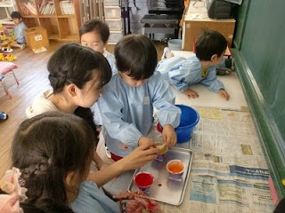 園での日々のようす 2011年9月29日2018年3月28日そめがみ遊び~ひよこぐみ~ 今日ひよこぐみは、そめがみ遊びをしていました。(運動会前ですが、色々な活動を行っています)三角に折ってある和紙を水に浸し、かるく絞ります。その3つの角に絵の具をつけて、そっと広げると・・・ キレイな色がついた紙の出来上がり!! 広げると、色がにじんでキレイな紙になることを、子ども達はとても喜んでいました。 この紙があるものに変身します。何に変身するのかな? 投稿ナビゲーション 前へ次へ 一覧へ戻る HOME 園での日々のようす そめがみ遊び~ひよこぐみ~