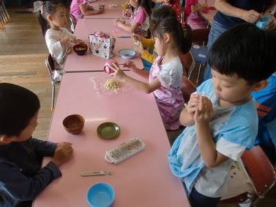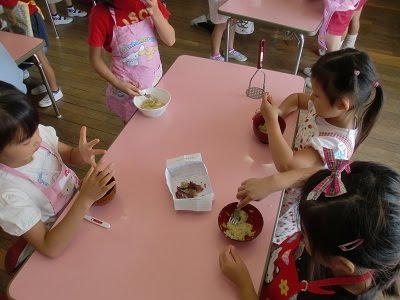 2011年10月25日2018年3月28日おいも団子作り 今日は、年長組さんはおいものお団子を作りました。まず、お芋を蒸かしています。 蒸かしたお芋を、お家から持って来てもらったお椀に入れ、フォークなどでつぶしました。手に付いたものをちょっとつまみ食い・・・「おいし~い」という声が聞こえてきました。 そこにちょっぴりお砂糖を入れ、ラップでお団子を作ります。 出来上がったお団子は、お弁当の時に食べました。 みんな大喜び。 簡単に出来て、とても美味しかったです。お家でも機会があったら、挑戦してみてくださいね。 投稿ナビゲーション 前へ次へ