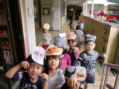 今日は、ひよこぐみ・年中組で、ハロウィーンの話を聞き、おばけに変身するためにお面を作っていました。