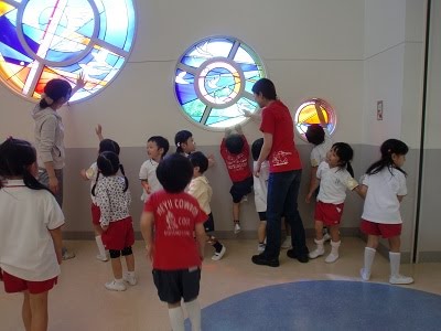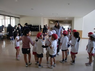 グラウンドで運動会を行いましたが、校舎内にゆっくり入るのは、初めての子ども達。高校のお姉さん達は授業中なので、みんな「し~!!」と言いながらです。 年長組は、高校生の授業が入っていなかったので、体育館で体操教室。
