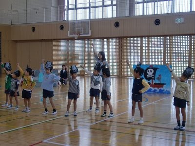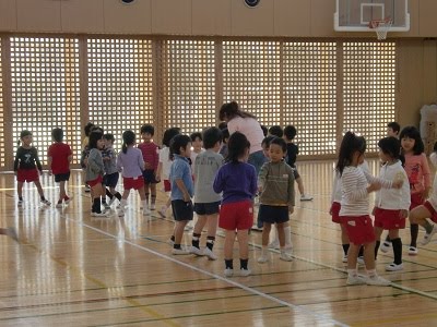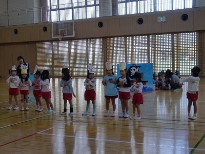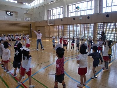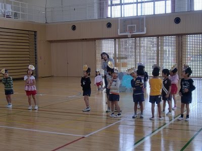 今日は、踊った後に、ルールのある遊び(今日は「どん・じゃんけん」の簡単バージョン)を行っていました。両サイドから走ってきて、出会った友達と手のひらを合わせた後、じゃんけんをするというもの。