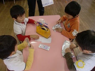 2011年11月14日2018年3月28日にじっこクラブ~お店やさんの用意~ にじっこクラブでは、今週の金曜日に「おみせやさんごっこ」をするそうです。そのために先週からお店の品物を作っていました。お花を作っている子。ひよこぐみの女の子は、お姉さんに「持っていてね」とお願いをし、セロテープをつけていました。 男の子は、携帯電話作り。「僕はスマートフォンにしよう」という声。今の子は、携帯がとても身近なんですね。 金曜日のお店屋さんごっこ、楽しそうですね。 また覗かせてもらおうと思っています。 投稿ナビゲーション 前へ次へ