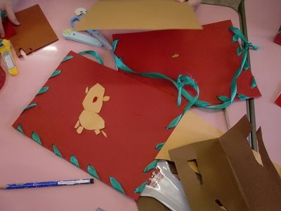 年長組は、先日紙を袋にしたものに、切った画用紙をはりつけていました。