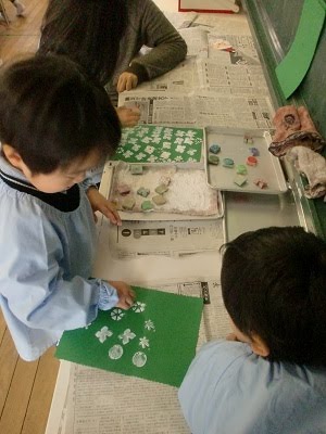 ツリーが出来た後は、きれいな模様のスタンプを押していました。