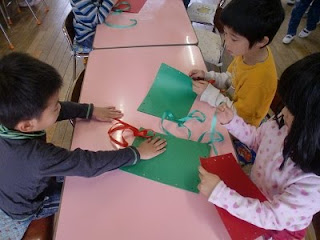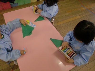 年少組は、折り紙を折ってクリスマスツリーを作っています。