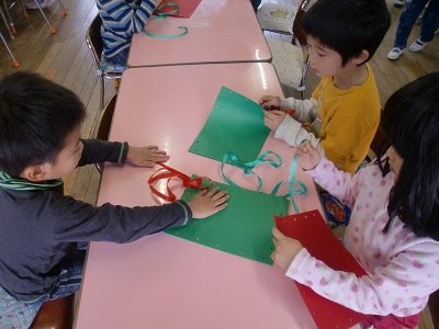 来週行われるクリスマス会に向けて、今日は年長と年少がプレゼントをいれてもらう袋を作っていました。