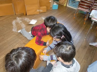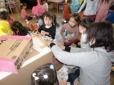園での日々のようす 2012年1月31日2018年3月28日協同作業は着々と 年長組は、今日も協同作業中。皆で相談したり役割分担をしながら進めています。 一人ひとりのイメージを同じものにし、取り組むためには、自分なりの考えを持つ、それを伝える、友達の考えを聞く、出来上がりを想像しながら方法を決めていくということが必要になってきます。一つのことに皆で取り組めるようになってきたことをとても嬉しく感じます。 年長組の各クラスには、出来上がった作品が増えてきました。 ゆきぐみは、お弁当を食べるスペースがなくなってしまったので、今日は遊戯室で食べていましたよ。 投稿ナビゲーション 前へ次へ 一覧へ戻る HOME 園での日々のようす 協同作業は着々と