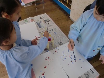 園での日々のようす 2012年1月26日2018年3月28日デカルコマニー2回目 年中組に行くと、「デカルコマニー」をしていました。2回目です。ストローの先に絵の具をつけて、白い紙にたらしていきます。 それを2つ折にして手のひらですりすり・・・ きれいな模様の出来上がり。 2回目でしたが、この「デカルコマニー」は同じ模様は出来ない・失敗がないということも楽しめる要因です。 紙を広げて「顔に見える」「かにみたい」など出来上がりから連想したりと、嬉しそうにしていましたよ。 投稿ナビゲーション 前へ次へ 一覧へ戻る HOME 園での日々のようす デカルコマニー2回目