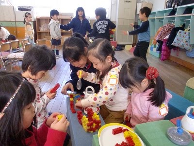 今日は、幼稚園の近くにある「大綱中学校」の2年生のお兄さん・お姉さんが、職業体験のため、来園しました。