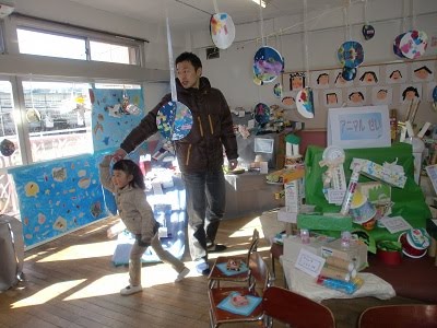 年長組さん。お父さんと一緒にひよこぐみの作品をコメントを読みながら見てくださっています。