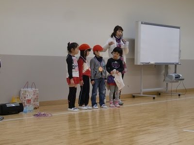 いつもの様に、最後まで跳びつづけた上位3名を表彰。全く同時に止まってしまったという子達もいました。