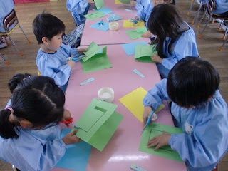 年長組は、ハサミを使って切っています。これまでの経験からハサミの使い方が大分上手になってきています。