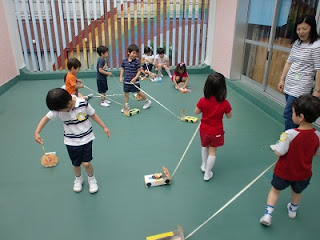 幼稚園の庭を嬉しそうにドライブする子ども達。
