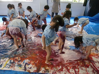 今日は年長ゆきぐみが、遊戯室で絵の具を楽しみました。