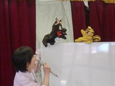 まずは、年長組と一緒に道路を歩く時に気をつけることを、かみおくんとりすこちゃんが教えてくれました。