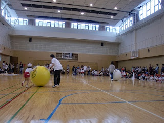 年長組の大玉ころがし。お家の人と息を合わせて、大玉をころがし、次の人につなぎます。