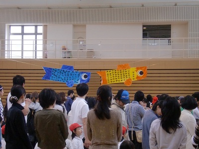 今日は、こいのぼり集会でした。雨模様だったので、体育館で行いました。まずは、年長組さんが作ったこいのぼりの紹介。絵の具をお兄さん・お姉さんの手で塗って作った、力作です。