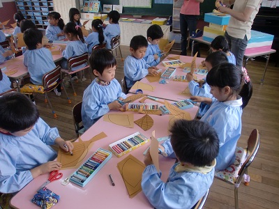 年長・年中組の部屋に行くと、あら?年長と年中の子が一緒に活動しています。なにやら楽しそう。はさみやクレヨンを使っている子。