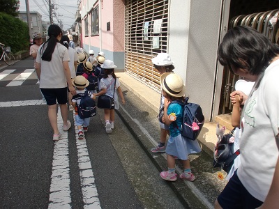 年長組のお兄さんやお姉さん達と手をつないで、ドキドキしながらも一生懸命歩いていました。