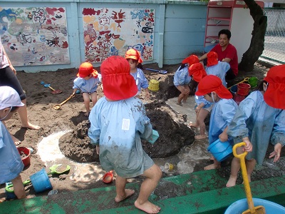 今までは砂場に水は入れていなかったのですが、今日は砂場の近くのたらいの水をせっせと運んでいました。