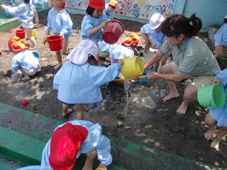 ♪雨降りクマの子 を歌いながら水を入れたり、お父さん先生が作ってくれた温泉に入る子も・・・。