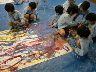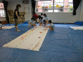 終わった頃には、身体や首・顔にも絵の具がついてしまっている子もいました(全部は幼稚園で落としきれずに帰ってしまった子も多いかもしれません、すみません)。