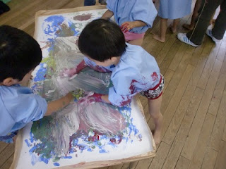最初はゆび一本から始めましたが、絵の具の感触が楽しく・・・