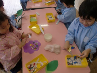 遊戯室ではたんぽぽぐみが紙の前に座っています。