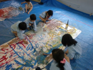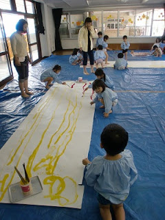 中には、自分で顔や手に色をつけてしまう子、筆を4本くらいまとめて持っている子、手で直接絵の具を触っている子・・・