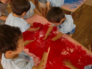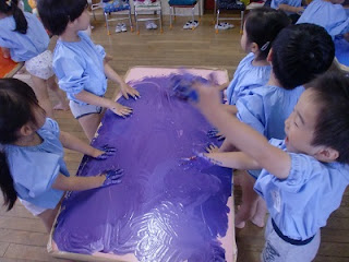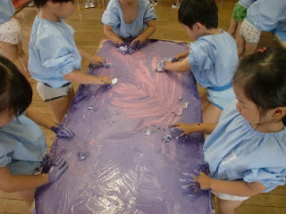 ちょっぴり冷たくて、ぬるぬるしていて、でも気持ち良い・・・そんな声が聞こえてきました。楽しくて、自分の手に塗って手袋をはめている様な状態になってしまった子もいました。色が混ざって違う色になることも楽しかったようです。