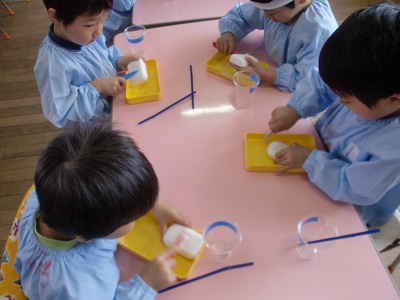 作り方を教えてもらった年長組は、部屋に戻って早速しゃぼん玉液作りに挑戦。