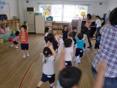 年少組は、表現あそび。音楽に合わせて踊ったり動いたり。