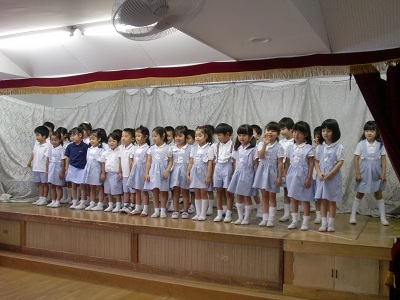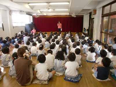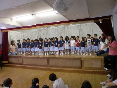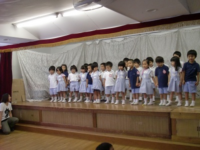 今日は、1学期の終業式。入園・進級した当初は、緊張していたり不安だったりという子も多くいましたが、少しずつ幼稚園に慣れ、安心して過ごせるようになりました。保護者の方のご協力があったからと感謝しています。